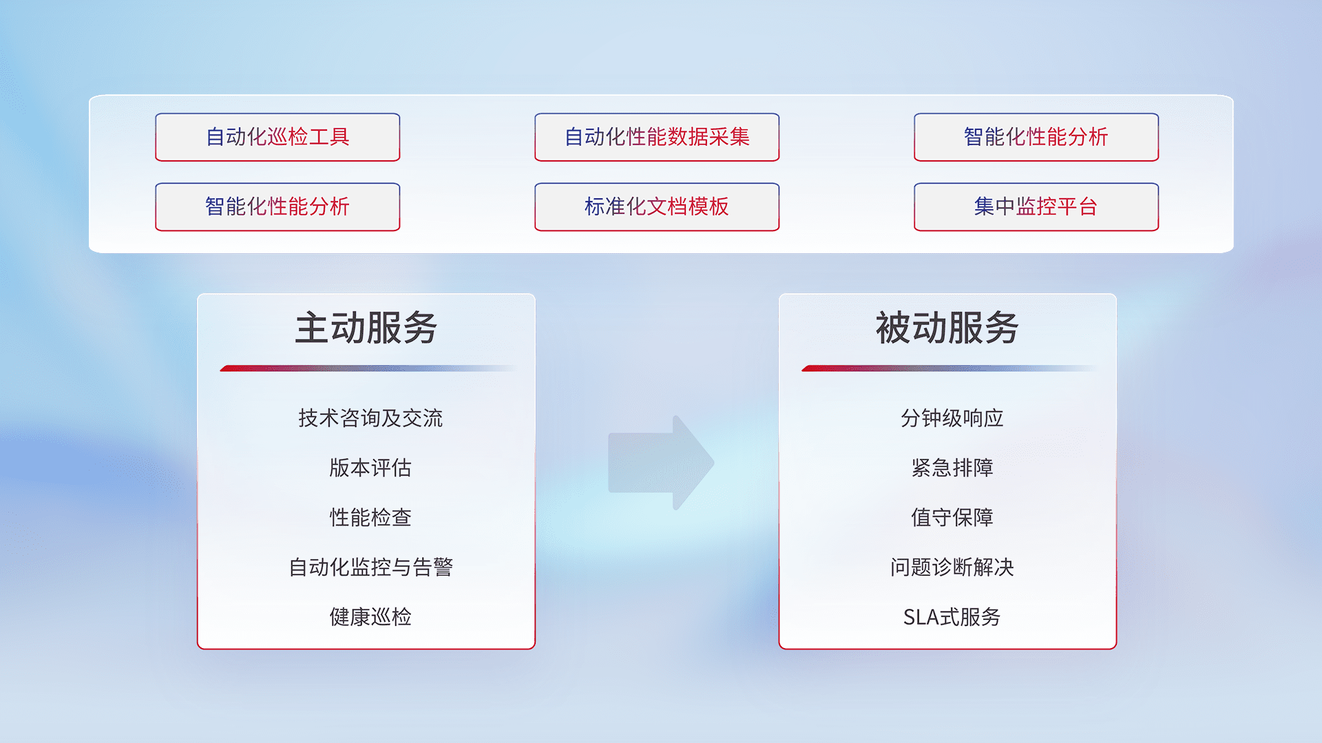 智能化工具和标准化文档,,,保障服务质量,,,提供主动服务(包含技术咨询、、、版本评估、、、性能检查、、、自动化监控与告警、、健康巡检)和被动服务包含(分钟级响应、、紧急排障、、、、值守保障、、、、问题诊断解决、、SLA服务)。。。。